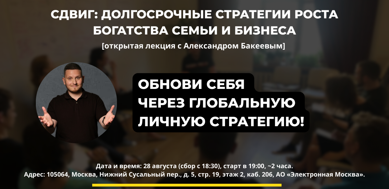 Вы можете сказать о себе, что у вас всё есть, кроме ответа «что дальше?» — лекция поможет найти ответ. Это спокойная, практичная лекция для тех, у кого уже есть своё дело и семья, но нет вектора дальнейшего развития.